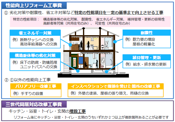 | 2.どんな費用が補助対象になるの? 住宅の性能向上リフォーム工事費 などが補助対象となります。 その他、複数世帯が同居しやすい住宅とするためのリフォーム工事費(三世代同居対応改修工事費)やインスペクション等の費用も補助対象。 ※インスペクションは、TAS企画にて承れます。 詳しい工事内容についてはご相談の上、サポートを受け賜っています。 |