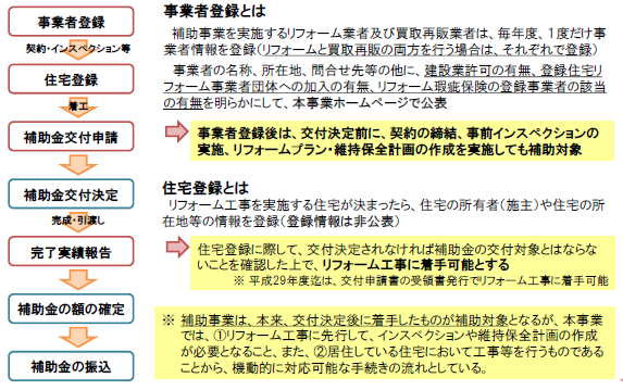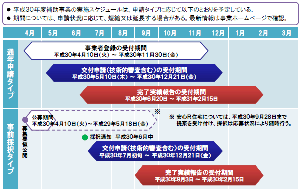 | 受付期間は、「通年申請タイプ」 の場合、11月30日までに事業者登録 を行うことで交付申請が可能。 「事前採択タイプ(安心R住宅)」 は 9月28日まで、提案を受付、応募状況に応じて随時、採択事業を決定する。 工法などについて施工業者・買取再販業者からの提案を受け付ける 「事前採択タイプ(提案型)」は 5月18日まで 提案を受付、 6月末をめどに採択事業を決定する予定。 |